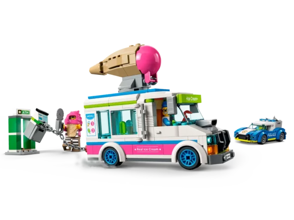 - Il set Il furgone dei gelati e l’inseguimento della polizia LEGO include anche minifigure dettagliate di un venditore di gelati e un poliziotto, ciascuna con il proprio stile e accessori distintivi.