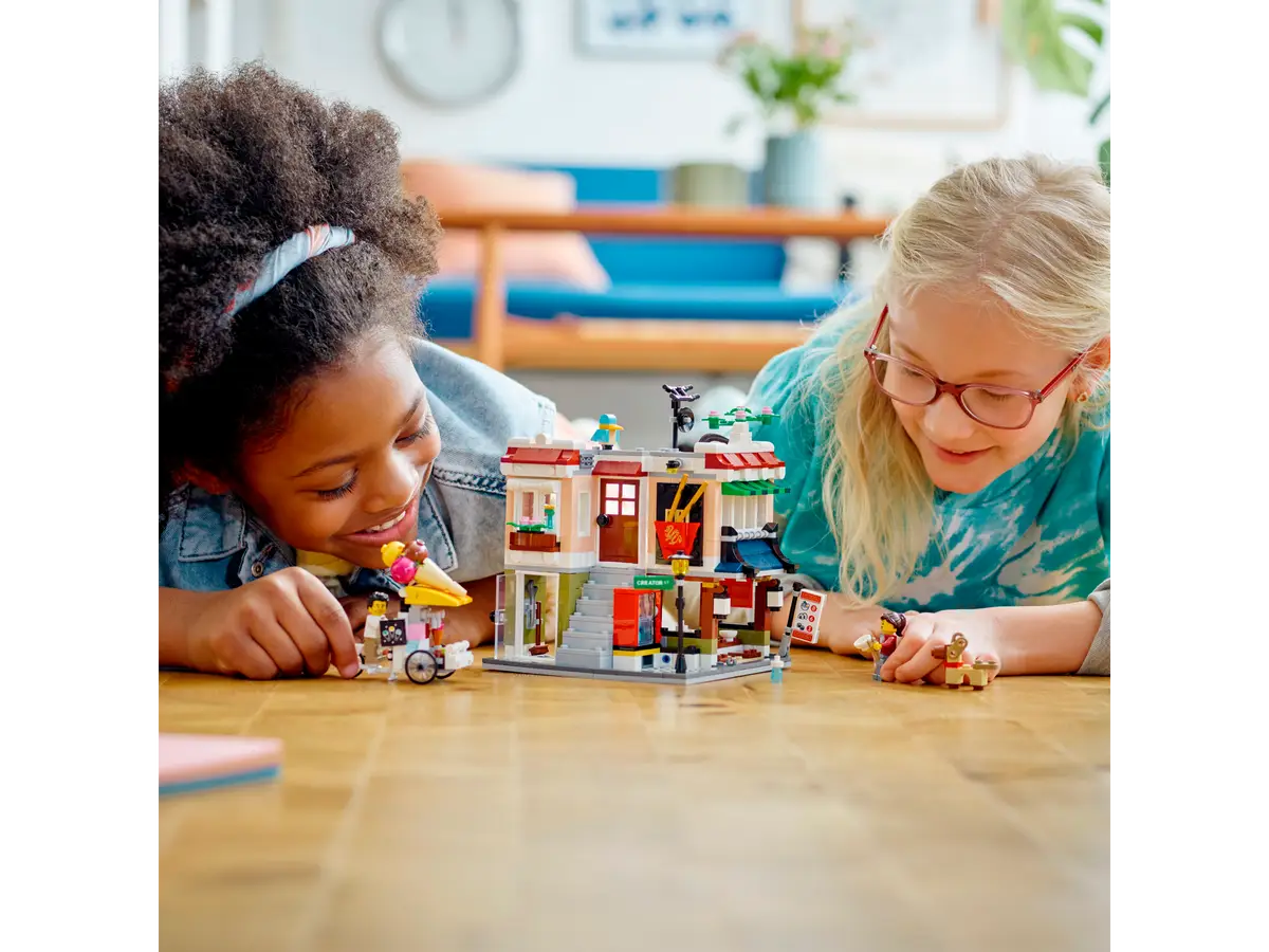 Utilizza tutti i mattoncini per costruire un Ristorante di Noodle a 2 piani, un appartamento, un negozio di biciclette con un’edicola e uno studio artistico e infine costruisci anche una sala giochi.